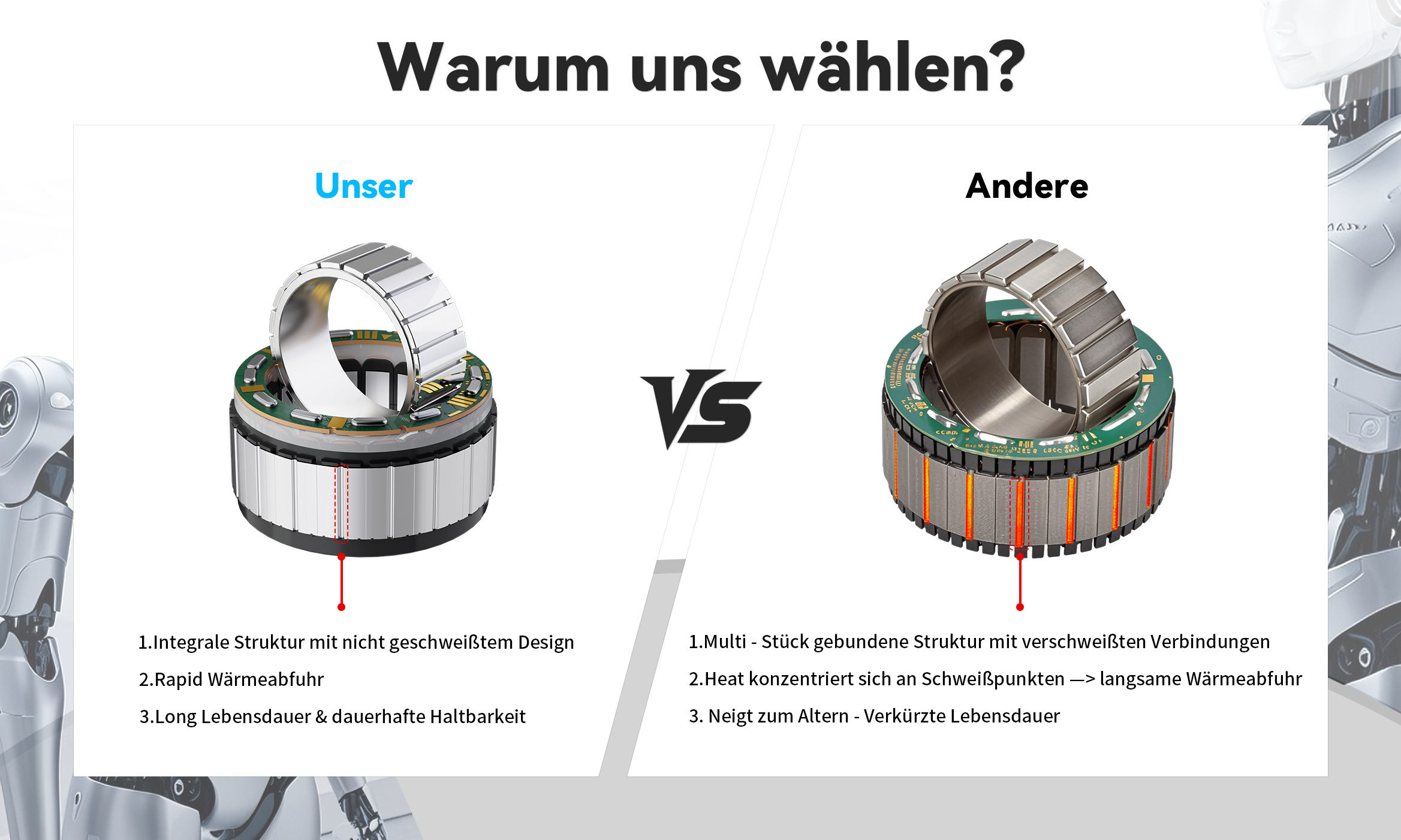 Mit optimiertem Kupferfüllverhältnis und fortschrittlichem magnetischem Design liefern unsere Hochdrehmomentdichte-Roboter-Gelenkmotoren (Bürstenlose Gleichstrommotoren, präzise Servomotoren) branchenführende Drehmomentdichte. Dynamische Tests zeigen 20 % höheres Drehmoment im Vergleich zu Standard-Schrittmotoren/AC-Motoren und [5]% schnellere Reaktion als traditionelle, koppelte Motorantriebssysteme.Bahnbrechend für anspruchsvolle Anwendungsfälle: humanoide Robotik & motorisierte Geländenavigation, Präzision hochleistungsfähiger Roboteraktuatoren sowie der Einsatz von robusten Robotergelenkaktuatoren. Weitere Informationen finden Sie im JEO Motor Solution Hub.